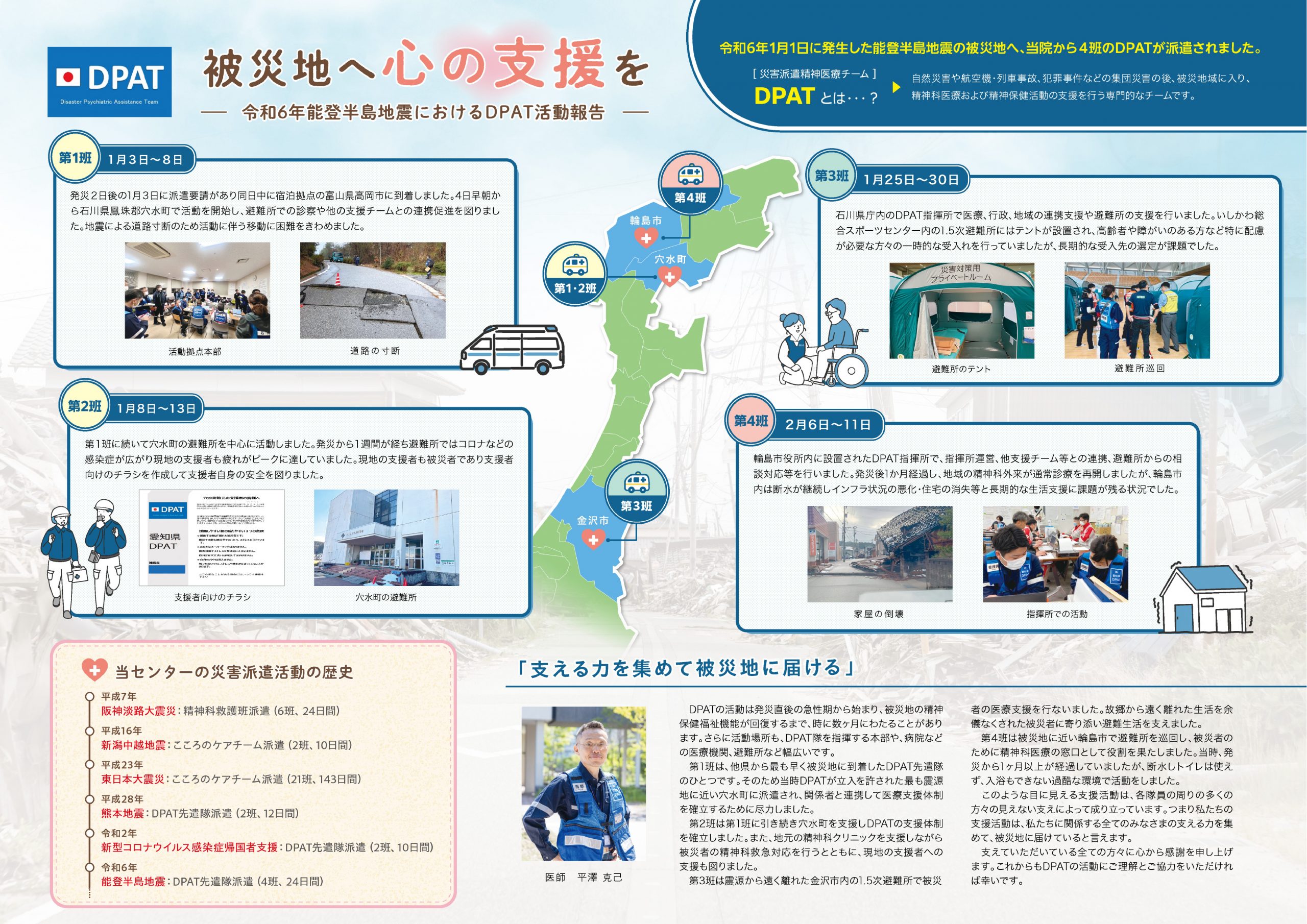 当院では平成26年にDPATを発足させ、熊本地震や新型コロナウイルス感染症帰国者支援、能登半島地震でDPAT先遣隊を派遣しました。